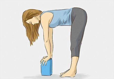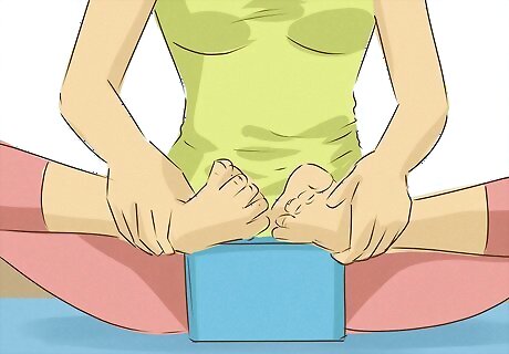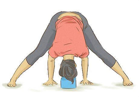 Rest your head on the block during a Wide-Legged Forward Bend. Standing with your feet just wider than your hips, place the block in front of you on the floor. Bend from the hips toward the floor, balancing your head on the yoga block to avoid overextending or straining.