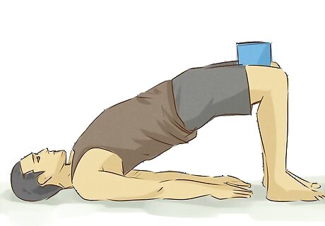 Hold the block between your thighs in Bridge Pose. Lie on your back and align your legs in a straight line with your hips. Bend your knees and place your feet flat on the ground. Place the block between your thighs. With arms to the side, press into your elbows and shoulders to lift up your back and hips toward the ceiling. Bring your hands together underneath of your back and move shoulder blades closer together on the mat. Instead of allowing your legs and knees to move apart, the block to ensure that you engage your legs. Proper alignment reduces the chances that an injury would occur during your practice.