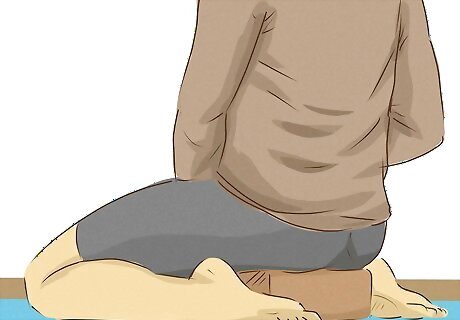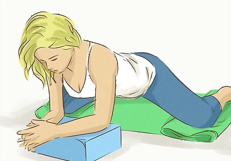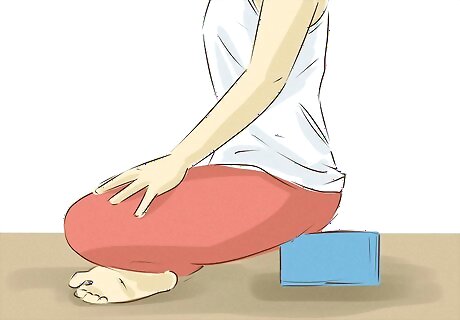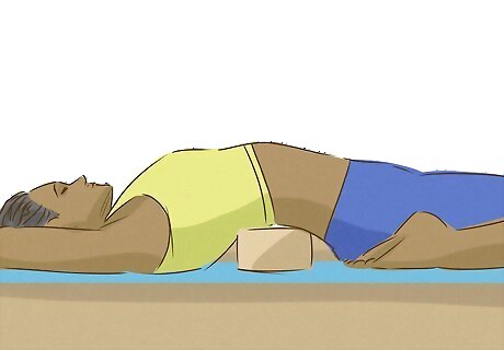 Use the block between your shoulder blades in Reclined Hero Pose. Kneeling with your feet slightly wider than hip-width, place the block in the space between your feet. Use your hands to help you lie back, with your block supporting your upper back. Rest your arms on the ground beside you. The block opens the chest to encourage breathing and relax the body. Breathing deeply during yoga is important to help the body perform at its optimal level.