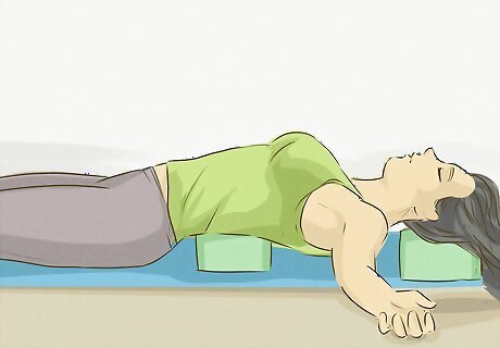 Use two blocks under your back and neck in Fish Pose. Sit in the middle of the mat, leaving enough behind you space to lie down. Place one block vertically where your shoulder blades and the other horizontally where your head will be. With your legs stretched out in front of you, lean back to position yourself onto the blocks and allow your arms to fall to the sides and rest on the mat. Creating this space in your chest allows you to relax more by breathing deeply.