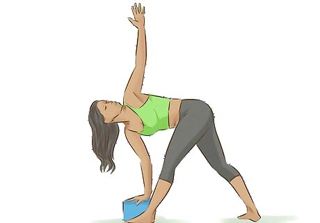 Position the block under your hand for stability in Triangle Pose. Keep your feet wide, making the distance between them about the length of your leg. Stretch your arms to your sides so they are parallel with the ground. Turn the toes of your the foot closest to the front of the room 45 to 90 degrees to face the front of your mat. Place your back hand on your hip and ease your front hand down the shin and then onto the block. The block reduces the risk of over-extending hamstrings and joints while opening the chest. Avoid locking your knees in this position.