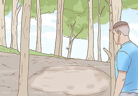 Build your fire away from dry grasses, shrubs, and trees. Find a spot of bare soil or exposed rock on which to build your fire. This will reduce the risk of debris on the ground catching fire. Make sure the location of your fire is at least 3 metres (9.8 ft) away from overhanging branches or other flammable materials, including your tent or lean-to. Build your fire at least 15 metres (49 ft) from any building.