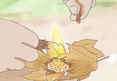 Break the tinder into fine pieces and pile it around the magnesium. Position the tinder pieces so that they overlap with but do not cover the entire pile of magnesium shavings. When the magnesium ignites, the tinder should be close enough to catch fire. Keep larger pieces of tinder within arm's reach to add onto the pile when it catches fire. Break up enough tinder to fill up your open hand.