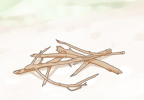 Collect small sticks and branches of various sizes for kindling and fuel. Before breaking out your emergency fire starter, you'll need a large supply of fuel to keep your fire burning. Collect sticks that are around the width of a pencil to use as kindling, and sticks and logs the width of your forearm or larger to keep your fire burning. Make sure all the sticks and branches you collect are dry and will burn easily. Collect as many dry sticks, twigs, and large branches as you can. Having more wood on hand than you need to keep your fire going is always better than unexpectedly running out.