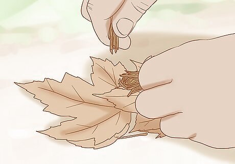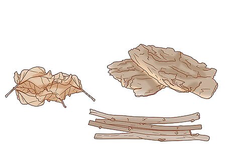 Gather dry and fine material to use as tinder. When it comes to tinder, the drier the material, the better. Dry leaves, pine needles, grass, bark, and small sticks all work great as tinder. Gather at least enough tinder to fill up your two open palms. It is always a good idea to carry a small bag or tin of dry tinder when hiking or camping, just in case wet weather makes it difficult to find dry tinder where you'll be starting your fire.