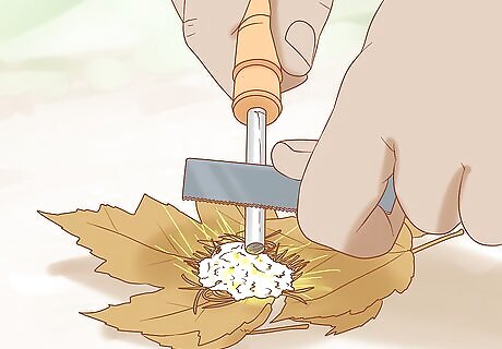 Use a metal blade to scrape shavings off your magnesium block. Use the metal blade that came with the fire starter kit or the back of a steel knife blade to scrape the corner of the block. Continue scraping until you have a small pile of magnesium shavings about the size of a medium-sized coin. Keep the pile of magnesium shavings on a dry leaf or other dry and flat surface. Depending on your specific fire starter kit, the magnesium might be in the shape of a rod instead of a block. Scrape the magnesium as close to the ground as possible so that you don't waste any of the shavings.