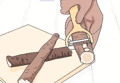 Cut off a 6 in (15 cm) segment of burdock root. Burdock roots can be really long and the exposed ends can be dry, so cut off a small segment that you can use for your tea. Use a kitchen knife to cut all the way through the root and remove a section. Store the unused portion of the root in your refrigerator to keep it fresher for longer. If you plan to make tea for 3-4 people, cut off a 10 in (25 cm) section.