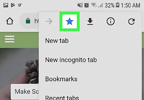 Add a bookmark. You can use bookmarks to save links to sites you want to access again in the future. To bookmark a site, open the site, tap ⁝ at the top-right corner, then tap the star. To view bookmarks, tap ⁝ and select Bookmarks. If your address bar is at the bottom, tap the star to open your bookmarks. Tap a bookmark to navigate to the site.