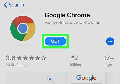 Install Chrome. If you haven’t yet installed Google Chrome, you can do so now for free. Here’s how to get it: Open the App Store iPhone App Store Icon. Tap Search (the magnifying glass). Type chrome into the search bar and press the Search key. Tap GET. If you’ve had Chrome in the past, tap the button with the cloud inside. Follow the on-screen instructions to install. To open Chrome, tap its round red, blue, yellow, and green icon on the home screen.