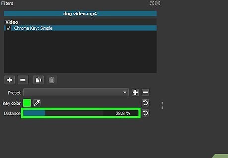 Adjust the green screen distance. Click and drag the "Distance" slider to the right until your green screen replacement image or video appears on the right side of the window. As a general rule, you want to avoid moving this slider over to the "100%" mark.