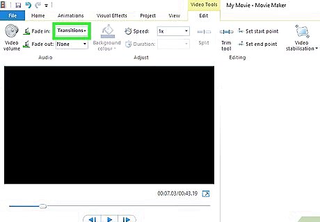 Click Transitions. It's a tab on the left side of the Windows Movie Maker window, just under the "Edit" heading there. A list of the currently available transitions will open. If you don't see this tab on the left side of the window, click the Edit tab at the top of the window and then select transitions.