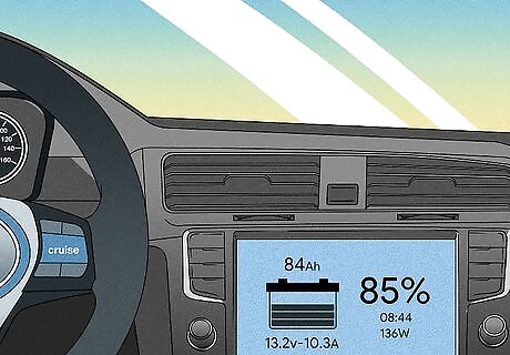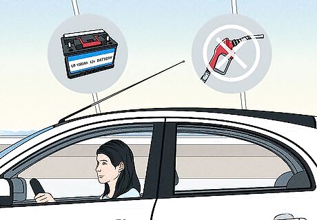 Use the battery rather than the gasoline engine. Your hybrid might offer the option of choosing when to switch from the battery to the gasoline engine. When possible, use the battery, since you will save money on gasoline. In some cases, such as highway driving, hybrids will generally switch over to the gasoline engine automatically. Drive within your vehicle’s battery range. Most hybrids allow between 10 and 35 miles of driving exclusively on the electric battery before they need to transition to a gasoline engine. Keep your drives short and at a close distance from your home. Stay close to home with your hybrid to maximize its efficiency.