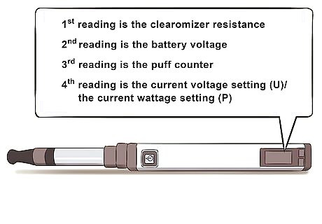 Check the settings. The iTaste VV 3.0 has variable wattage and voltage settings that let you control the temperature of your vapor. You can customize your vape by changing the settings. To check the settings, turn the device on by pushing the power/fire button three times. Hold the + and – buttons together for two seconds. Look at the display screen for your current settings: The first reading is the clearomizer resistance The second reading is the battery voltage The third reading is the puff counter The fourth reading is the current voltage setting (U) or the current wattage setting (P)