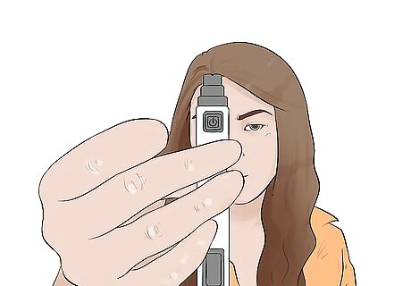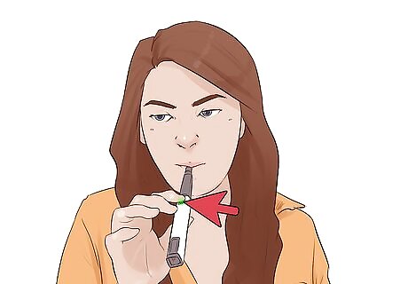 Press and hold the fire button to vape. When the device is turned on, pressing the fire button will engage the battery and vaporize the juice inside the device. As you press the fire button, suck on the mouthpiece to pull the vapor into your mouth. The puff counter on the device will keep track of how many times you press the fire button and vape.