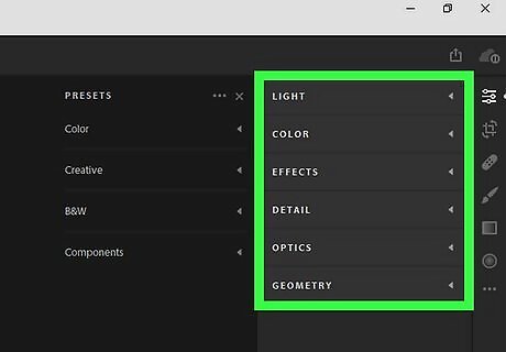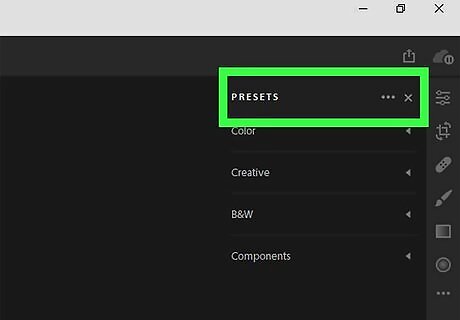 Click the PRESETS tab. It’s at the top of the right panel. This displays a list of preset filters you can use. The presets are broken into groups. Click the arrow next to each group in the right panel to see its contents. Click one of the previews to apply it to your image.