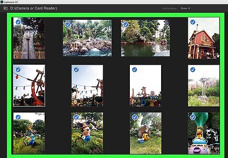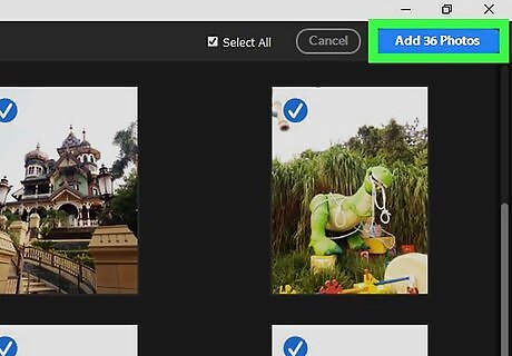 Select the photos you want to add. Clicking a photo preview adds a check mark to the photo, indicating that it’s selected. If the photos are all in one folder, select the folder, then click Review for Import (Mac) or Choose Folder (PC). To select one or more individual photos, click each photo you want to add (hold Ctrl (PC) or ⌘ Command (Mac) as you click to select multiple photos at once), then click Review for Import.