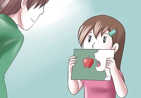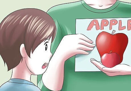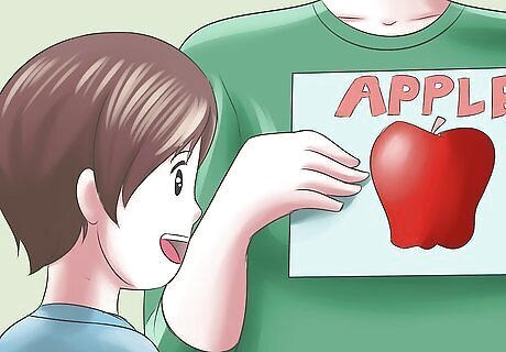 Work on word association with the child. It can be harder for autistic children to read and remember words than it is for them to remember something that they have heard. Pictures can help autistic children to remember a written word and also to remember a word that they have heard. For example, you could write the word "sun" on a flashcard while showing them a picture of a bright yellow sun at the same time. This allows them to make an association between the picture and the card. Flashcards can also be used to teach autistic children verbs. For example, you could write the verb “laugh” down on a flashcard and then act it out for them so that they can remember it through your actions. Different actions can be taught this way by showing flashcards of words and then asking the child to act them out. In this way, the words and the actions both are being taught at the same time.