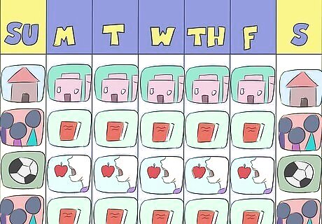 Create a schedule for the child with visual cues. Pictures and colors can also be used to create pictorial or visual calendars to help the child understand on what days they have school, on what days they do not, and to mark any upcoming events or any specific activities. The calendar should be developed in such a manner that uses mostly symbolic representation. On the days when the child has school, a small image/photo/picture of the school could be put on the calendar; on days when the child has no school, a picture of a house can be used; if the child has an activity like soccer to attend, then a picture of a small soccer ball could be drawn. Color-coding could also be used. On the days when there is school, those days on the calendar could be colored blue; when there is no school, it could be colored yellow. Then other colors can be used to represent other activities.