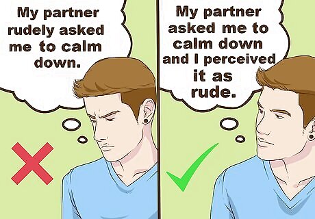Understand that communication is filtered through your own perceptions. When you are having a conversation, it is important to understand that everything you hear is filtered through your own perceptions. This means that what you actually hear is your perception of their words. For example, you may think, “My partner rudely asked me to calm down.” If you use respeak you would think, “My partner asked me to calm down and I perceived it as rude.” When you make this adjustment in your thoughts, you realize that what you perceive may be different from what your partner intended. This can help to solve many miscommunications that happen in relationships.