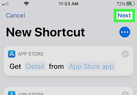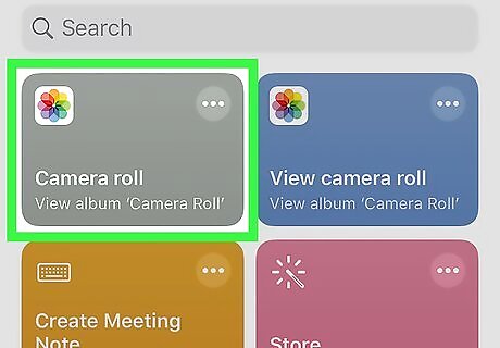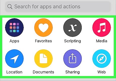 Select an action. There are many ways to do this: Scroll down and select one of the suggested actions, which may include actions like creating a tweet, texting a contact, or running a certain feature of an app. To run an app, tap Apps at the top of the screen or type the app's name into the search bar at the bottom to find something specific. Once you've found the app, tap it, and then choose additional functions as prompted. Tap Media at the top of the screen to view a list of possible actions drawn from the photo, video, and music apps on your phone or tablet. Tap Scripting at the top-right corner for more advanced shortcut creation tools. Tap Favorites to see actions you've added to your Favorites list.