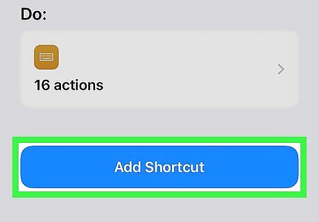 Tap Get Shortcut to install. It's the blue button at the bottom of the page. You'll see a confirmation message that says "Added to My Shortcuts." To view all shortcuts you've added, tap My Shortcuts at the bottom-left corner of the screen.