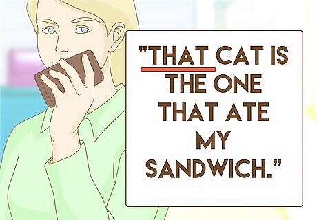 Use "that" to describe an object in a statement. "That" can serve another function. It can also be used as an adjective. An adjective describes a noun. In this case, the adjective is used to indicate which object the person is referring to, as in, "That cat is the one that ate my sandwich."