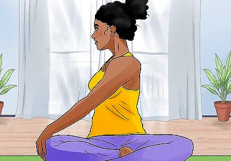 Sit upright with your spine lifted and do a variation of Perfect Pose. Unlike the classic Perfect Pose (Siddhasana), this variation (Bharadvajasana) involves a twist! To begin, return to the standard Easy Pose seated position. Place your right hand on your left knee as you inhale. Support yourself by placing your left hand behind you. Focus on your breathing as you twist your upper body to your left. Hold for 1 minute, then switch sides. This posture is believed to help regulate nervous energy and maintain balance.