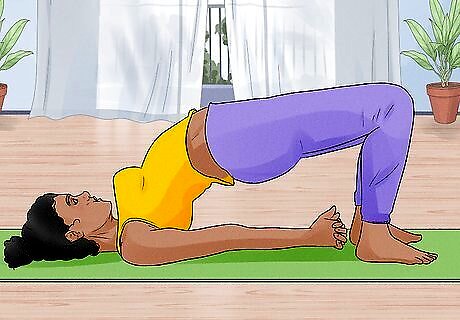 Raise your pelvis up off the floor to do Bridge Pose. Start Bridge Pose (Setu Bandha Sarvangasana) by lying flat on your back. Place your feet flat on the floor and draw them back until they are directly below your knees. As you do this, inhale and lift your pelvis, using your hands for support. Relax your arms next to you, or use them to support your back. Hold for 1 minute or longer. This pose can be rejuvenating for those who spend a lot of time sitting or driving. Since it is a mild inversion, it may help provide relief from stress, anxiety and fatigue. Variation: If you are having a hard time keeping your hips lifted, use a yoga block or pillows under your tail bone.