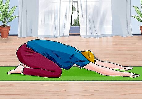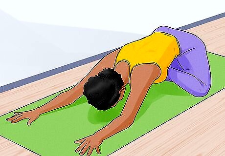 Kneel on the floor to do Wide-Knee Child’s Pose. Begin Balasana by kneeling on the floor with your toes touching and your knees hip-width apart. Breathe out and lower your torso down against your thighs, resting your arms to your sides, palms up, so your hands are next to your feet. Touch your forehead to the ground. Hold the pose for up to 5 minutes. To reduce tension in your brow, slowly turn your head from side to side while keeping your forehead in contact with your yoga mat. As a more challenging alternative, reach your hands out forward, palms down on the floor. Focus on your breathing technique during this and every pose in your bedtime session!