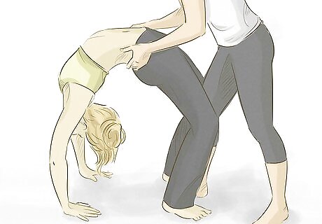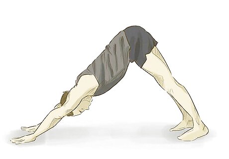 Strengthen your spine with downward facing dog. Downward facing dog is a classic yoga pose that also provides strengthening benefits for your entire body. To get into downward facing dog, start on your hands and knees on the floor. Make sure your knees are directly under your hips, your wrists directly under your shoulders. On an exhale, straighten your legs, lifting your hips up towards the ceiling. Roll over your feet onto your toes, stretching your heels down towards the floor. Your arms should be extended straight towards the floor. Roll your shoulders back so that your shoulder blades run along the sides of your spine. Stay in downward dog for 5 to 10 deep breaths, pulling down through your heels and up through your shoulders to maintain weight balance and distribution. Relax your neck and allow your head to lower.