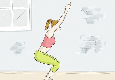 Work your arms and legs with chair pose. Come to a standing position with your arms loosely to your sides to get into chair pose. Slide your feet together so that your big toes are touching, heels slightly apart. Focus on your breath. As you inhale, extend your arms straight up toward the ceiling. You can keep them apart with palms facing each other, or bring your palms together above your head. On an exhale, bend your knees and lower your hips to the floor. Try to keep your knees from projecting out over your toes. They will move forward a little, but keep your shins as perpendicular to the floor as possible. Hold the pose for 5 to 10 breath cycles, breathing deeply. Make sure your shoulders are rolled back and not hunched. Squeeze a yoga block or a book between your knees to further build your thigh muscles.