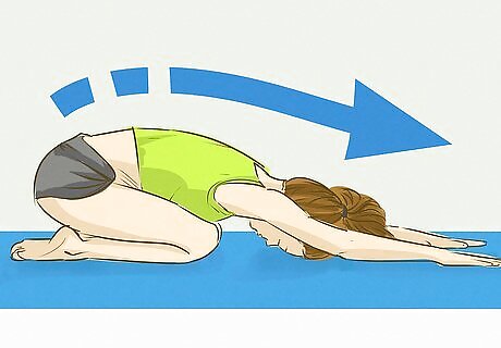Relax in child's pose. Child's pose is a common way to end any yoga routine, because it allows your body to relax and allows you to return your focus to your breath. Child's pose also provides strengthening and lengthening for your spine and back muscles. Lower onto all fours from downward dog, then continue to drive your hips back until you are resting on your heels. You can draw your knees together or keep them spread. Hinge forward from the hips as you slide your hands forward, folding over your legs to the floor. Rest your forehead on the floor if it's comfortable. If you don’t want to rest your head on the floor, layer your forearms in front of you, then rest your head on your arms. As another alternative, you can rest your head on a yoga block. Make sure you don’t let your head dangle, as this can cause neck injury.