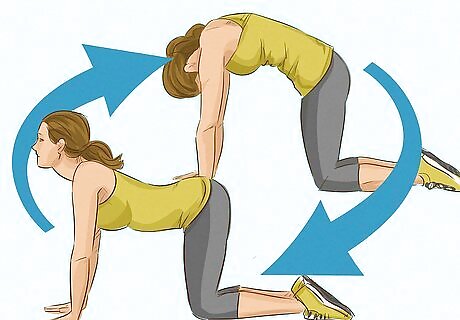Warm up with the cat/cow stretch. Moving between the cat and cow poses is a good way to loosen up your spine and warm up your entire body as you start a yoga routine. It also stimulates your internal organs and increases circulation to your torso. Start on all fours with your knees directly under your hips and your wrists in line with your shoulders. Avoid hyperextension in the elbows; it is better to keep a very soft bend in them. On an inhale, arch your back, pressing your tailbone into the air. Drop your shoulders down your back and cast your gaze forward. This is the cow pose. As you exhale, round your back, curling your shoulders downward. Drop your gaze down to the floor. This is the cat pose. Continue going back and forth between cat and cow, with a breath between each movement, for 10 to 20 deep breath cycles.