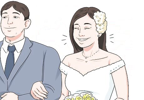 Ask your escort to lock arms with you. Once you’re holding your bouquet and have your arms in a comfortable position, ask the person (or people) escorting you down the aisle to link arms with you. This keeps you comfortable, rather than trying to adjust to where your escort’s arm is.