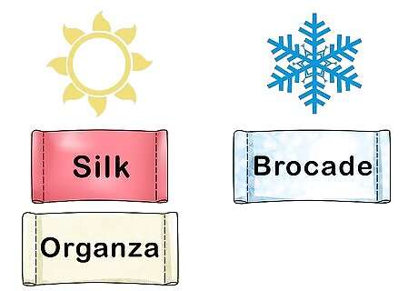 Choose fabric appropriate to the season. You want to make sure that your dress matches the season, not only for style, but for your own comfort! If you're getting married in the summer, consider light fabrics like silk or organza. For colder seasons, consider a warmer fabric like brocade.