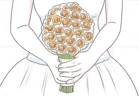 Hold your bouquet at your waist. This gives your guests a better view of your gown. It also feels a little more natural than trying to hold your bouquet up near your chest. When you’re holding your bouquet, make a diamond shape with your arms and the bouquet. Your shoulders should be down, with your arms bent out slightly at the elbow.