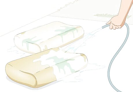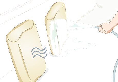 Spray the cushions with a hose to rinse them off. To remove the suds, you’ll need to use a garden hose to rinse the cushions down. Be thorough and try to completely soak the cushions all the way through. Never use a power or pressure washer on fabric, as it can create tears.