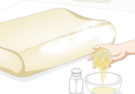 Mix 1 tablespoon (15 mL) of lemon juice and salt for a natural option. If you would rather stay away from household chemical solutions for health or safety reasons, a lemon salt mixture will do the job. Scrub the mixture into the fabric on spots with mildew and mold and watch it dissolve. In this solution, citric acid from the lemon juice combines with salt to help break up the fungi, and the undissolved salt crystals act as an abrasive.