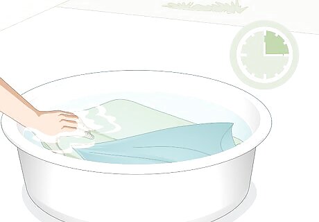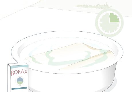 Soak the cushions in water and Borax for 15 minutes. You can either add ⁄4 cup (59 mL) of Borax to a hand-washing solution, or, if your cushions are especially covered in mold or mildew, you can create a separate Borax and water solution with ⁄4 cup (59 mL) and 1 gallon (3.8 L) of water. Make the solution in a large container like a plastic bin or a tub so that you have room to soak the cushions. You can add baking soda to help break up the mildew’s stains as well.
