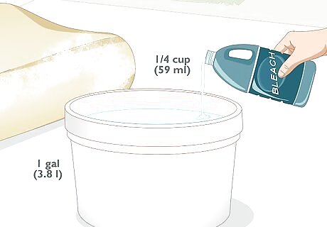 Combine ⁄4 cup (59 mL) of bleach and 1 gallon (3.8 L) of water. Scrubbing away mold and mildew with bleach will also sanitize the area and remove stains. While bleach alone can fade or discolor dark fabric, a mild bleach and water solution will most likely keep your colors safe. If you are concerned about discoloration, you can add less bleach to the water. Never use a bleach solution if you used ammonia on the cushions, as this will create poisonous chemicals that are harmful to your health. Use gloves if you use bleach to clean your cushions.