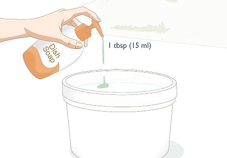 Add 1 tablespoon (15 mL) of dishwashing solution to a bucket of water. Combine the dish soap and 1 gallon (3.8 L) of warm water in a bucket, tub, or plastic bin. This will be the hand-washing solution for you to use as you clean the cushion and its cover. Laundry detergent is too highly concentrated for use when washing fabrics by hand, but you may be able to find ready-made hand washing solutions at fabric or home goods stores.