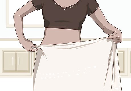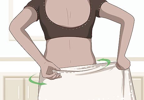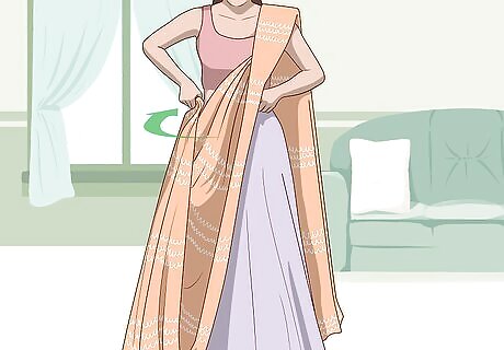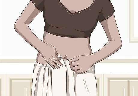 Wrap it once around your waist from right to left. Keep the wrap slightly loose during this phase so you have some slack in the fabric to work with. Stop once you reach your right side again. Tuck the fabric neatly in the waistline of your lehenga and pull to tighten as needed.