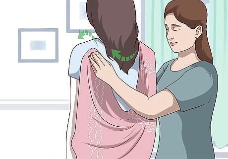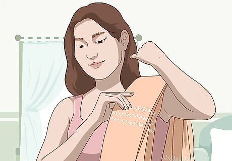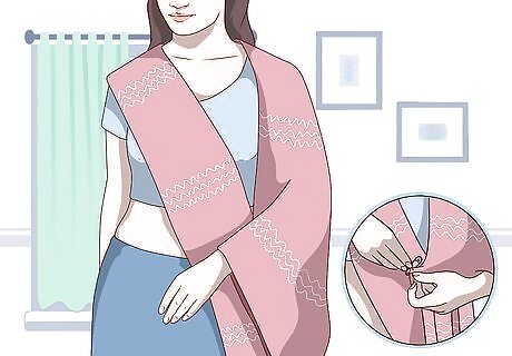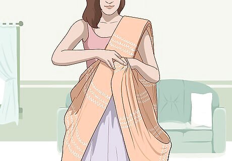 Move the flowing end of the fabric over your left shoulder. It should run behind your back and then up over your shoulder. Allow the loose end to rest over your shoulder. Slowly pull the fabric when its in place to straighten it out.