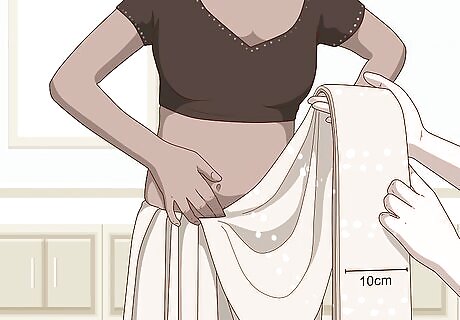 Pin to your right shoulder at half-length. Measure 4-7 inches (10-13 cm) over from the first pin and add a second. If you are concerned about safety pins being seen, you can pin from underneath the saree to minimize the pin being exposed. .