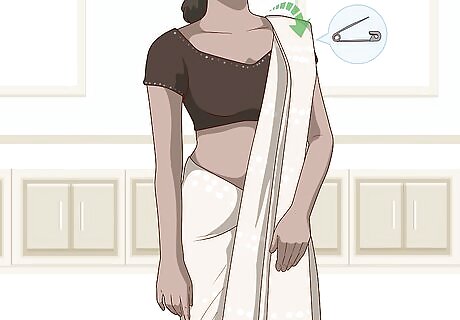 Drape the saree over your left shoulder. Slowly pull the fabric as you drape to keep it orderly. Once the end is at your shoulder, use a safety pin to securely fasten in place. A second safety pin can be added slightly below the first one for backup and extra support.