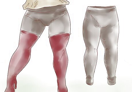 Pair with leggings or tights. Pair your thigh-highs with opaque tights, leggings, or nylons. These often slenderize and shape legs, and in colder weather help your legs feel warmer. Pair brightly colored or interestingly printed leggings with black or brown boots, because attention will be drawn down to your legs, your leggings, and your boots. Wear a less intense pair of leggings or tights with a more exciting pair of tall boots (boots that hit your calf, or your knee are both great for this).