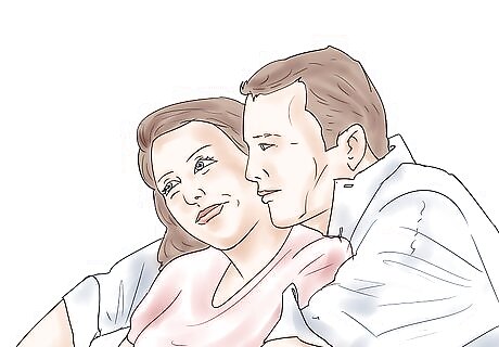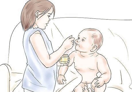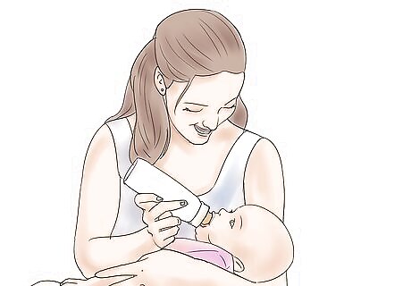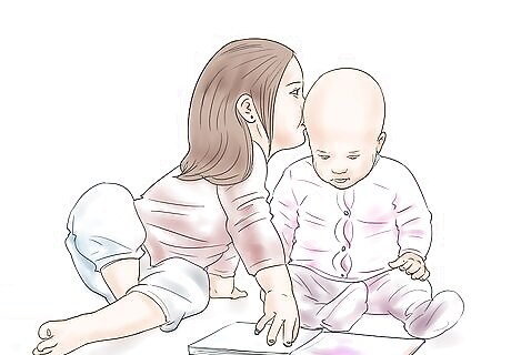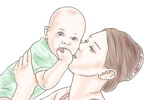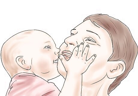 Be physically present. Beyond just being there for your baby when they need you, it is important that you shower the baby with affection and love, which can be achieved through physical contact. Hold your baby as often as possible, rocking, cuddling, and feeding them. Hold the baby in your arms whenever you can and never leave them unattended in a crib or baby seat for long periods of time. Make eye contact with the baby while you feed them or rock her in your arms - this will help to establish a bond between the two of you. Smile at the baby whenever they look at you and talk to them in a soothing, loving voice. In time, they will come to associate these actions with safety and love and will learn to respond in kind. If you are busy, place the baby in a sling and carry them against your chest so they can hear your heartbeat and become accustomed to your scent.