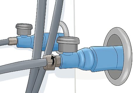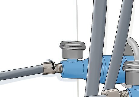 Disconnect the cold water supply line from the valve with a wrench. Locate the end of the water line that runs from the bottom of your regular faucet and attaches to the water supply valve. Use a wrench to unscrew the end of the line from where it connects to the water supply valve and separate it. Leave the water line connected to the bottom of your sink. The cold water supply line will be labeled as “Cold” on the valve or will have a blue ring if you have both hot and cold water lines.