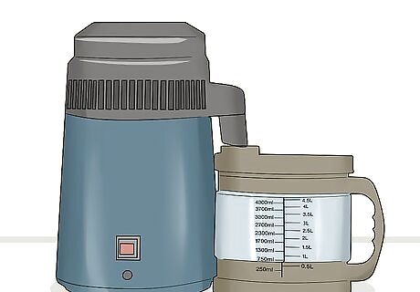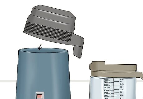 Place the water distiller on a flat surface and plug it in. A water distiller purifies water by heating it so it evaporates and then collects the condensation, which is free of contaminants. Place the distiller on a flat and stable surface such as a countertop or table. Plug it into an electrical outlet to power it. Some distillers can be charged, powered by batteries, or even use solar power to work. Make sure your distiller has power before you use it.