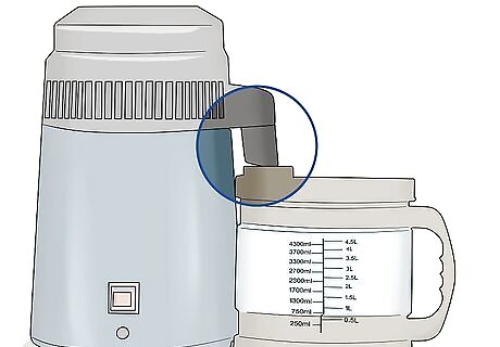 Make sure a container is beneath the faucet to catch the distilled water. Many water distillers come with a collection container, but you can also use a glass or other container to catch the distilled water as it drips from the nozzle. Place the container beneath the drip nozzle before you start the distiller so it’s ready.